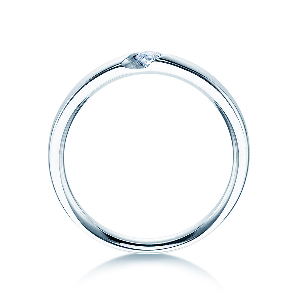 Une bague tension sobre et élégante, classique à première vue. On remarque le raffinement du modèle Italic en le regardant de plus près : solidement niché dans le serti en diagonale, son diamant brille de mille feux grâce à la lumière pénétrant par les côtés ouverts de l'anneau.